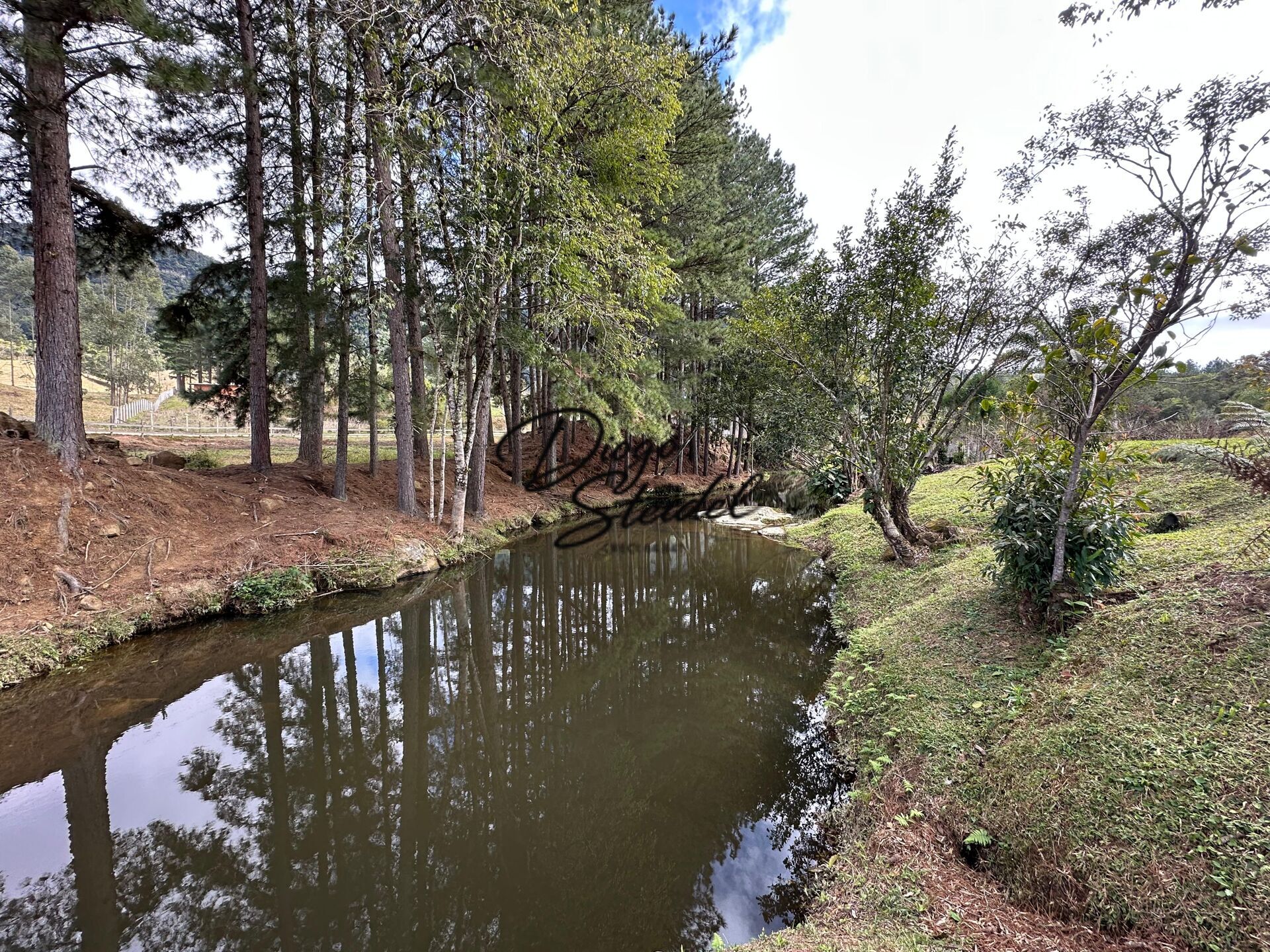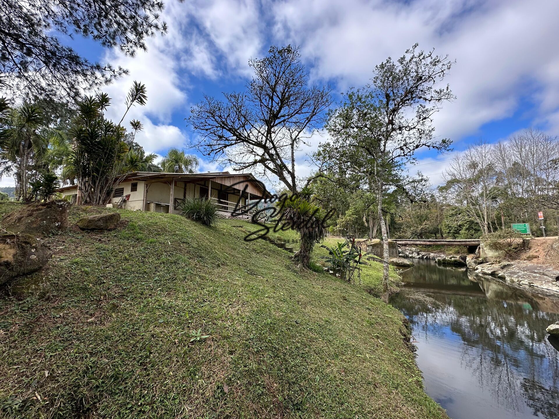 Área de festas ao lado da lagoa, 2 varandas (frontal e nos fundos) com vista para o riacho, e excelente posição no terreno, com divisa junto ao ribeirão.